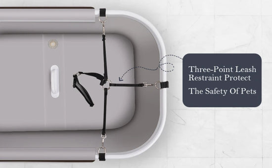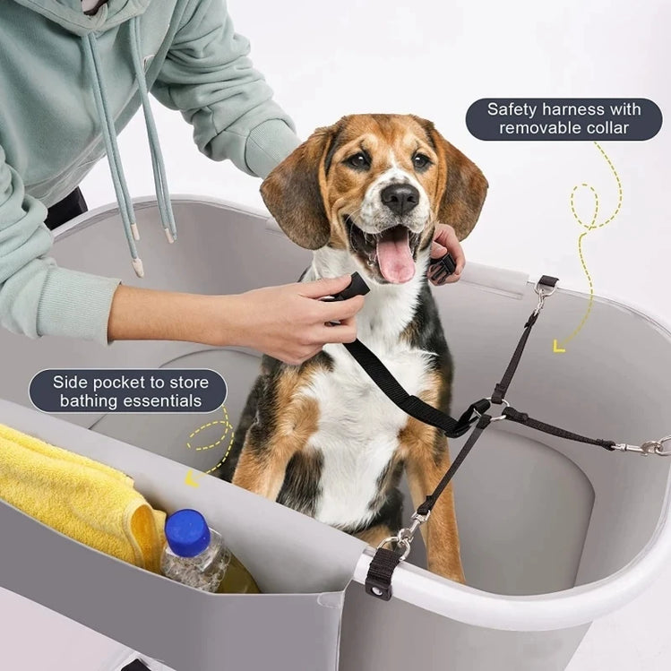 Dog shower with carding arm and detachable annular safety belt, 2 long drainage channels, side pocket perforated design, effective drainage, convenient cleaning, and pet care kit.